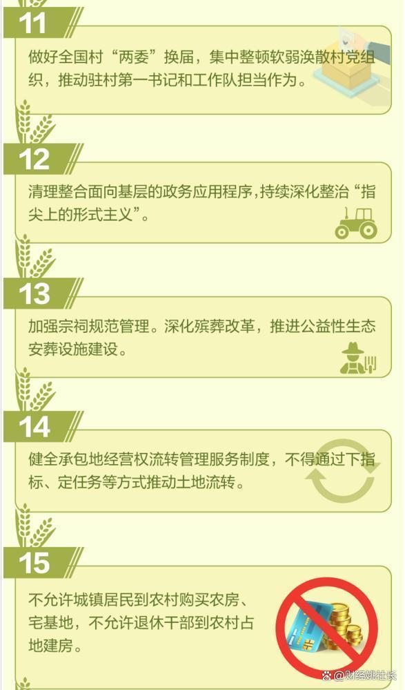 强化农业面源污染突出区域系统治理,加强畜禽粪污资源化利用和水产养殖尾水处理。四:健全承包地经营权流转管理服务制度,不得通过下指标、定任务等方式推动土地流转。